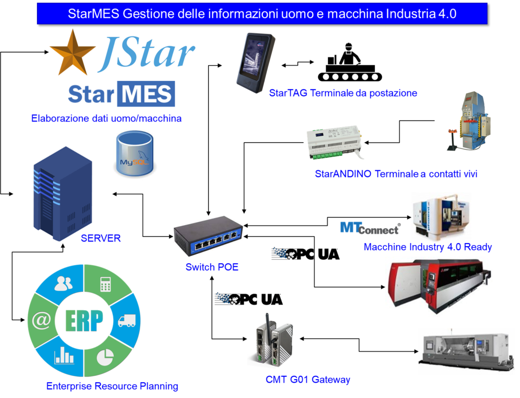 Interfacciato con l’ ERP aziendale che genera le informazioni sugli ordini di produzione emessi, elabora automaticamente le informazioni da inviare alle postazioni di lavoro e alle macchine collegate alla rete aziendale tramite i moduli StarERP e StarBRIDGE dedicati ai vari protocolli di comunicazione e restituisce le informazioni sui tempi di lavorazione in automatico all’ ERP aziendale. Queste funzionalità sono condizioni richieste dalla normativa fiscale per ottenere la completa conformità degli investimenti tecnologici aziendali alle agevolazioni del credito di imposta previsto dal Piano Nazionale industria 4.0.